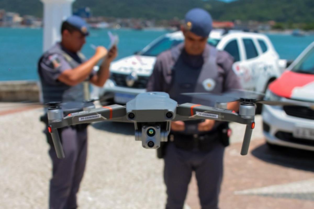 Os drones, posicionados em áreas com indicadores criminais e maior concentração de pessoas, captam imagens integradas ao programa Muralha Paulista, que possui 1,7 mil câmeras no litoral.
