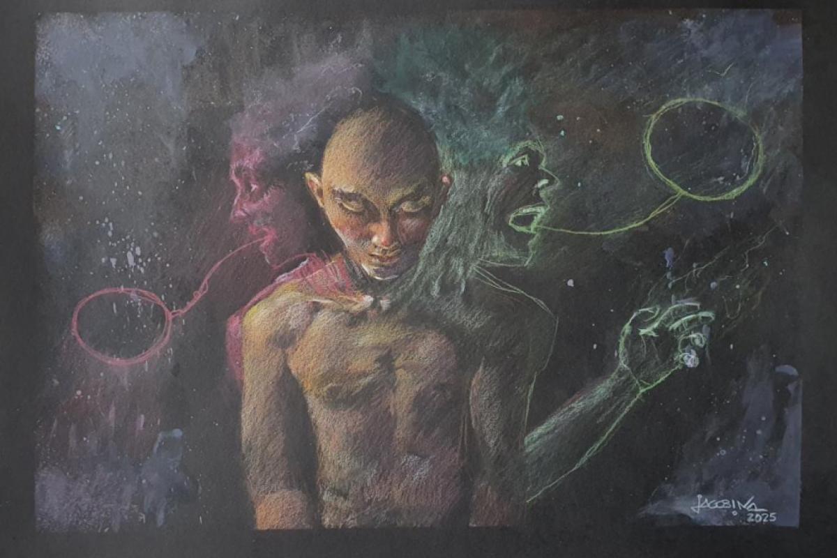 Pinturas, desenhos e gravuras compõem a mostra que dá forma à sentimentos como esgotamento emocional, ansiedade e os impactos do uso excessivo de tecnologia nas relações afetivas.