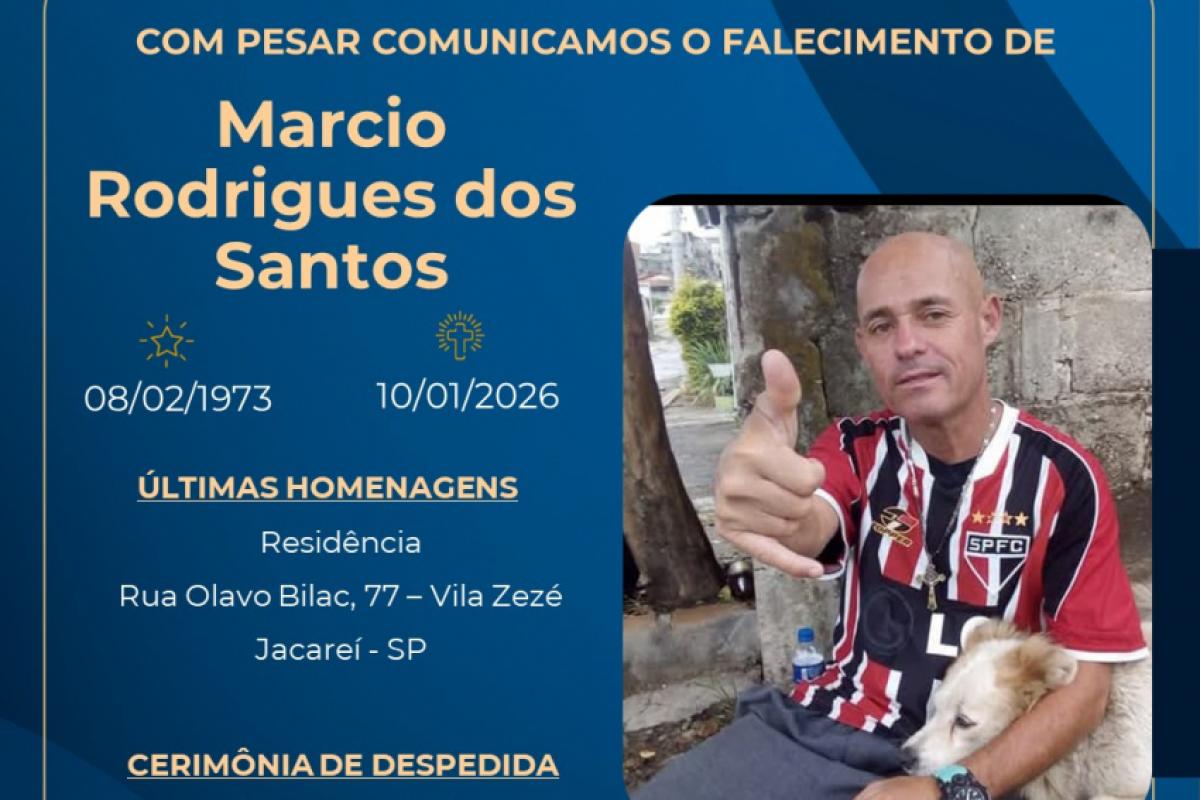 Márcio Rodrigues dos Santos morreu aos 52 anos, em Jacareí, neste último sábado. Ele foi sepultado na tarde deste domingo (11), no Cemitério Jardim da Paz, no Parque Santo Antônio.
