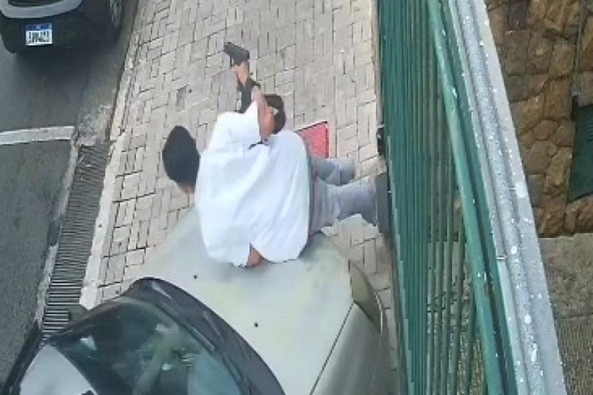 Três homens descem do veículo, enquanto uma quarta pessoa deixa o local dirigindo o automóvel. Já dentro da padaria, outras imagens mostram a entrada de dois suspeitos; um deles conversa com um atendente, mexe na mochila, ameaça o funcionário com uma arma e, em seguida, rouba um cliente que estava próximo a outra atendente.