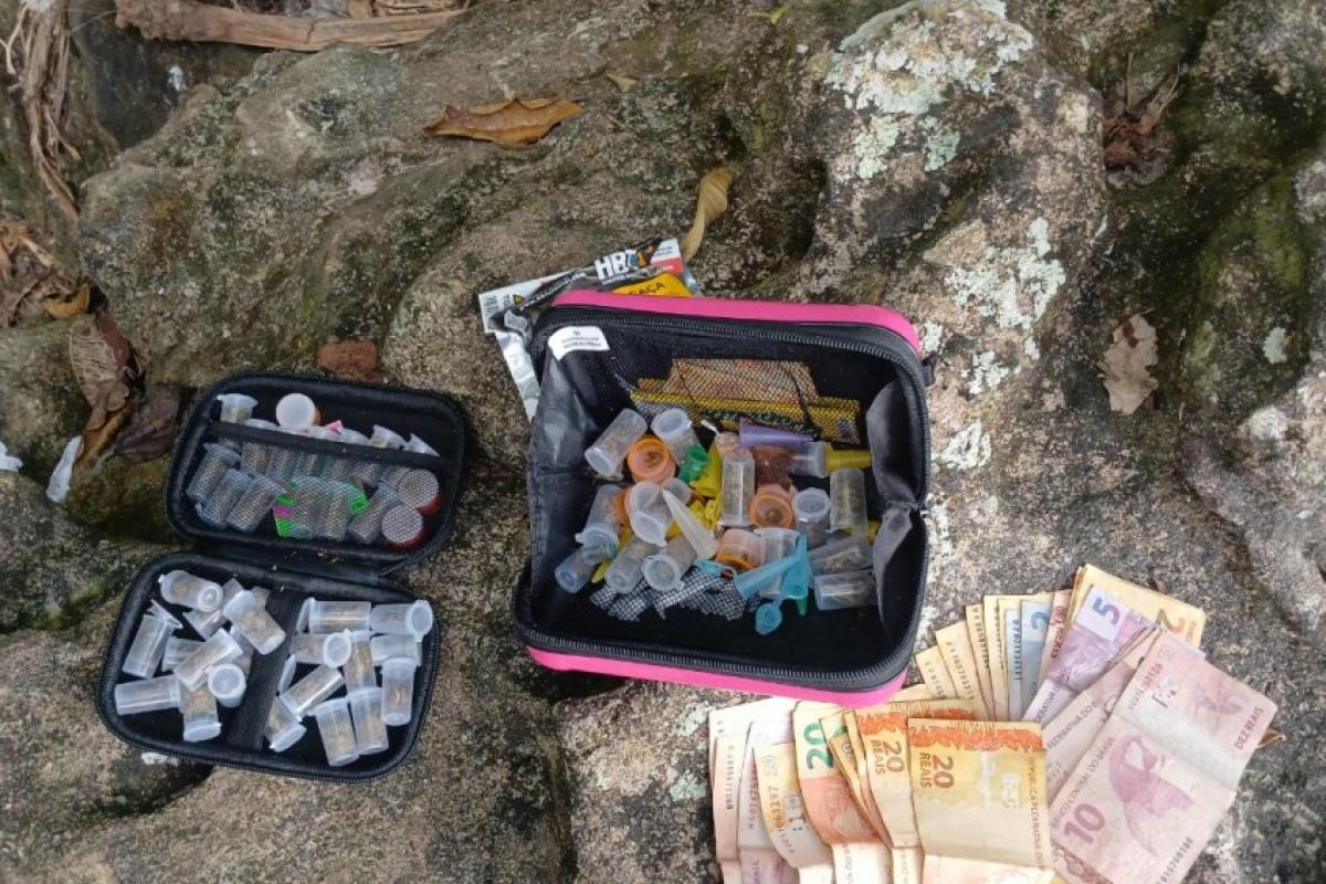 Durante a abordagem, os policiais localizaram diversas porções de maconha e cocaína, além de dinheiro, objetos de valor e anotações relacionadas ao tráfico.