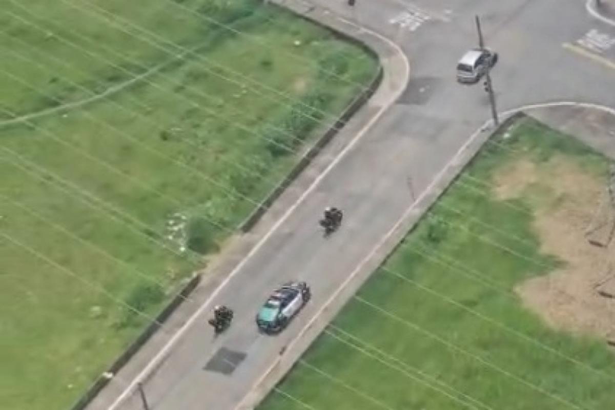 A cena mostra viaturas da GCM e do Gtam (Grupo Tático com Moto), de São José, em perseguição aos criminosos por ruas de São José. Dois homens foram presos.