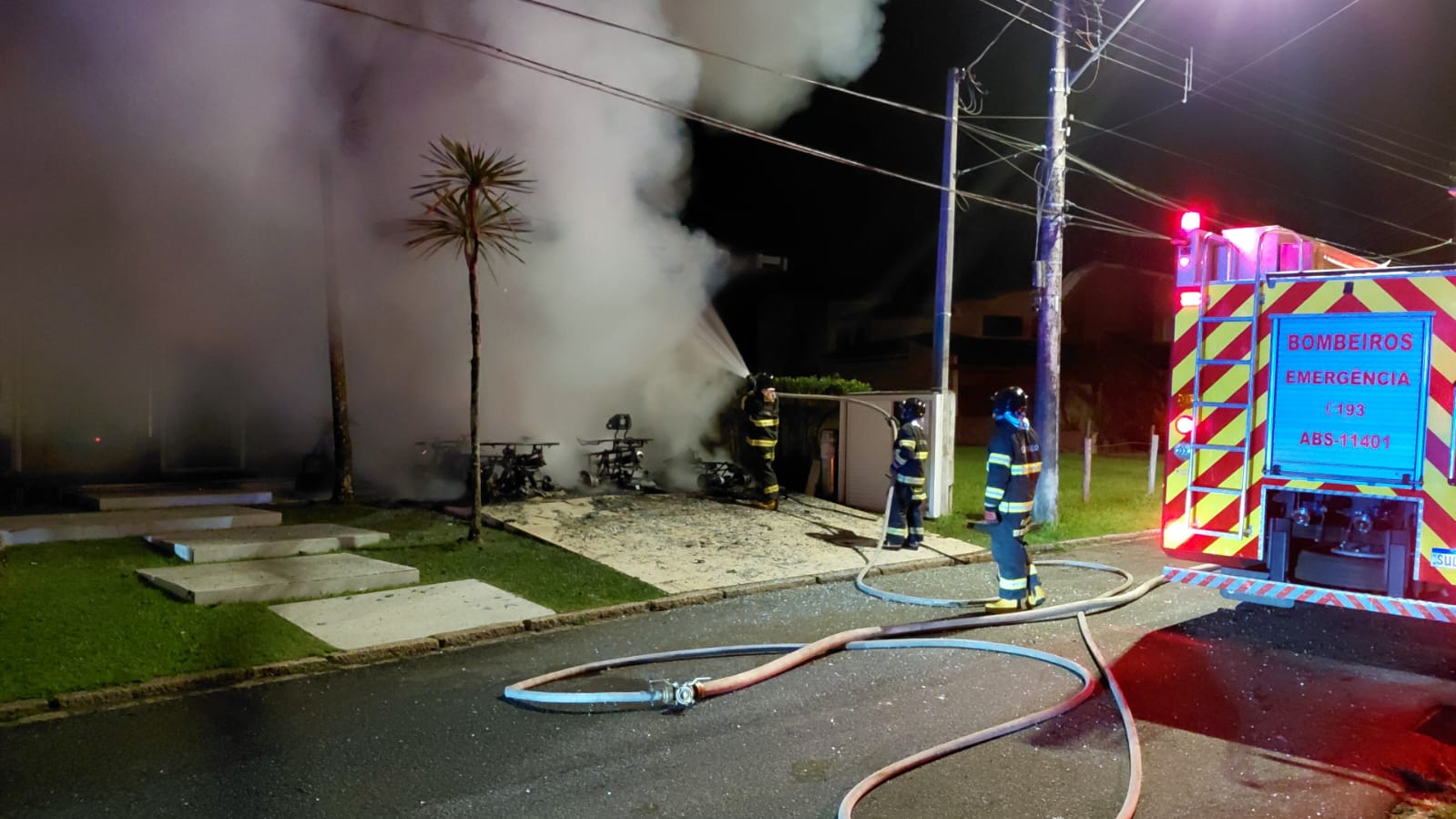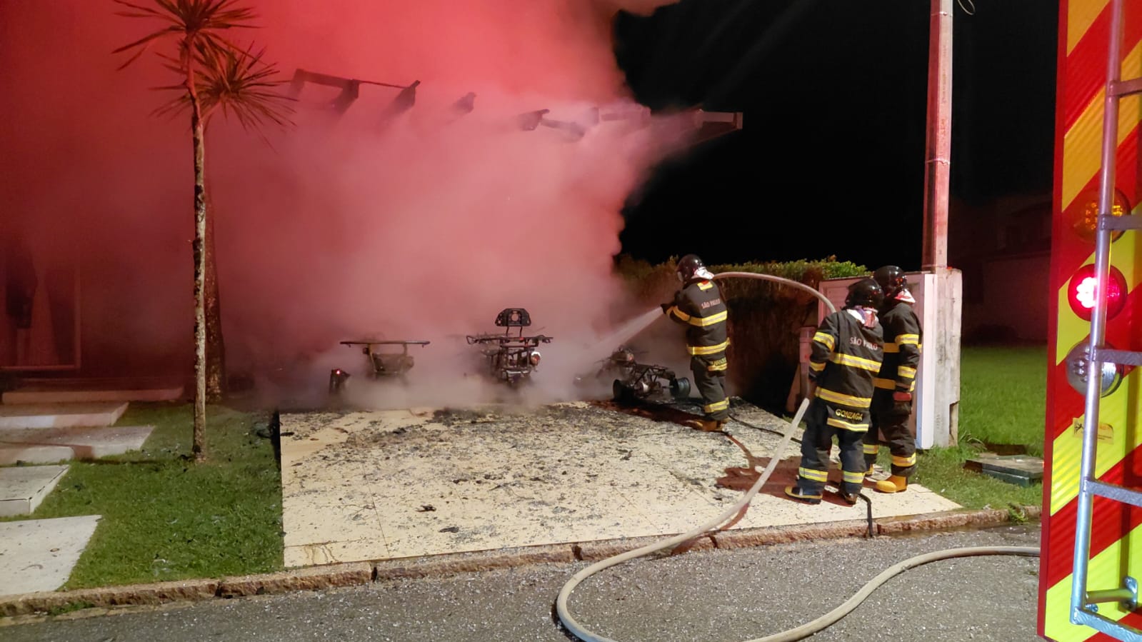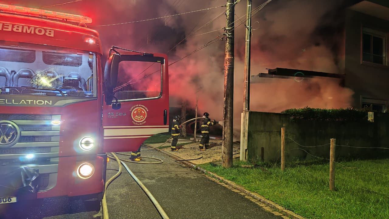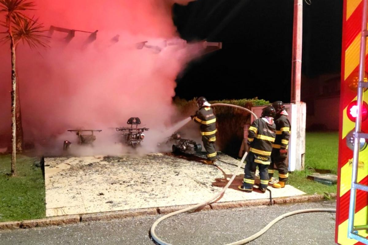 O fogo começou na garagem de uma das residências, destruindo um pergolado, quadriciclos e duas motos elétricas.