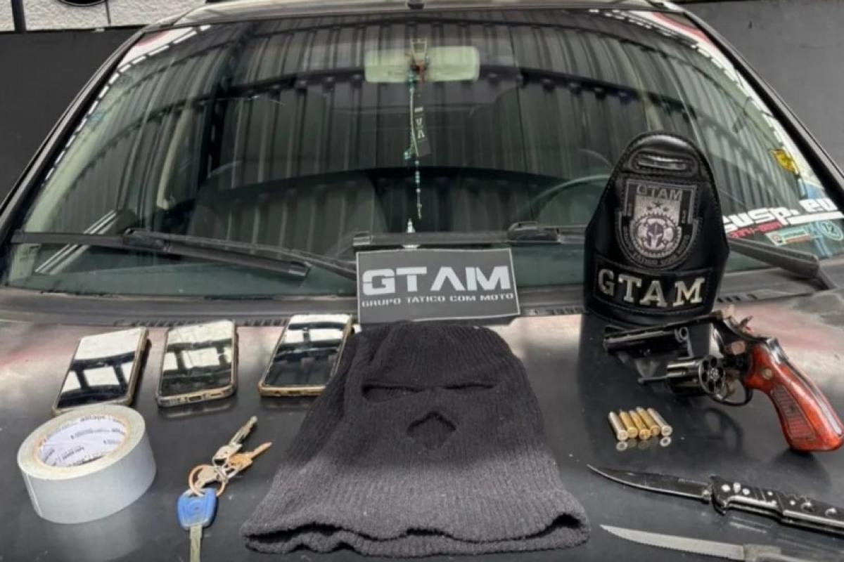 Durante a revista no automóvel, a equipe encontrou diversos apetrechos utilizados em atividades criminosas, além do armamento supostamente utilizado no delito.