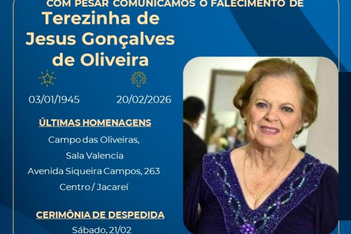 Terezinha de Jesus Gonçalves de Oliveira morreu aos 81 anos na última sexta-feira (20), em Jacareí. E o sepultamento acontecue no sábado (21) à tarde, no Cemitério Campo da Saudade, no bairro Avareí.