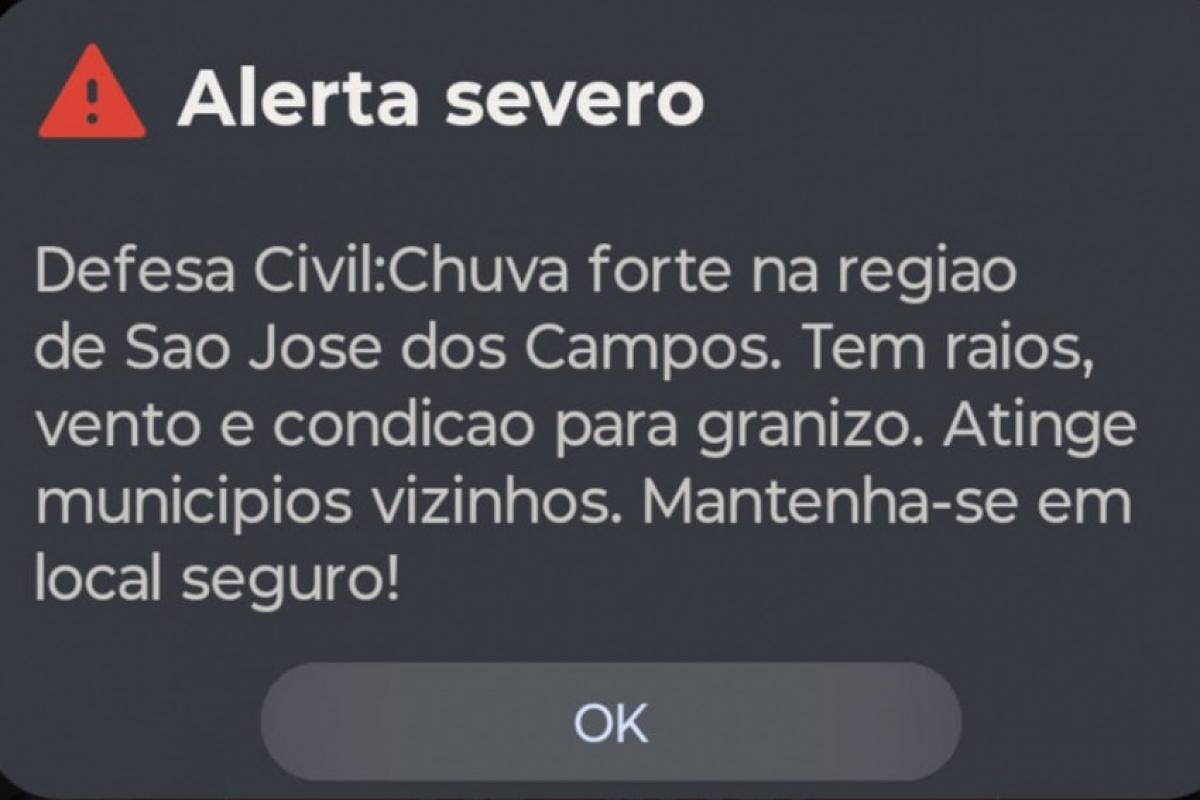 O aviso, enviado por meio do sistema de alerta nos celulares, indicava a ocorrência de chuva forte acompanhada de raios, ventos intensos e possibilidade de granizo, além do risco de atingir municípios vizinhos. A orientação foi para que a população buscasse abrigo em locais seguros.