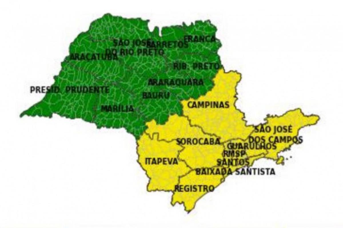 Mapa da Defesa Civil mostra a região em amarelo, situação de 'atenção' para chuvas