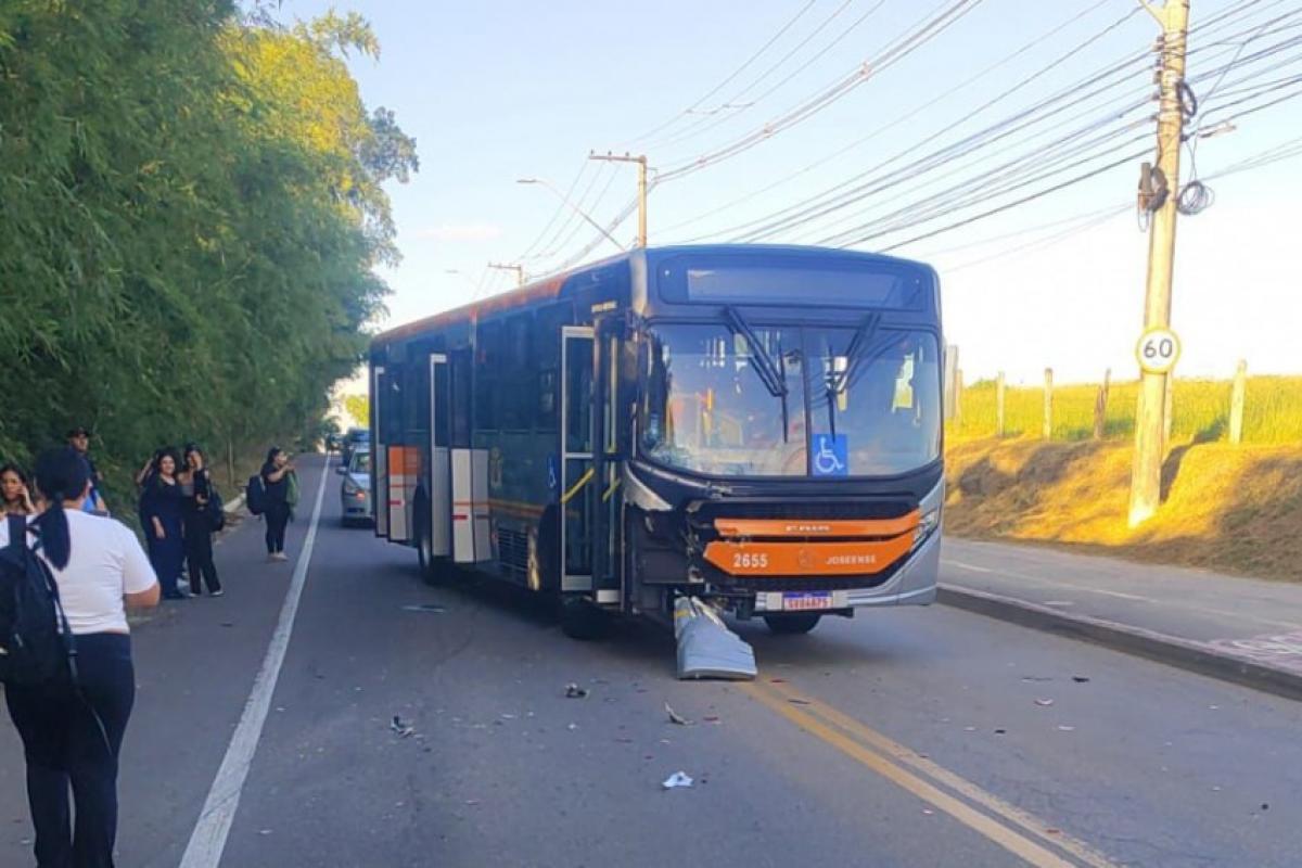Um acidente de trânsito envolvendo um automóvel e um ônibus do transporte coletivo causou estragos e congestionamento na tarde desta quinta-feira (16) no bairro Eugênio de Melo, zona leste de São José dos Campos. A força da colisão deixou o carro completamente destruído e danificou a parte dianteira do coletivo.
