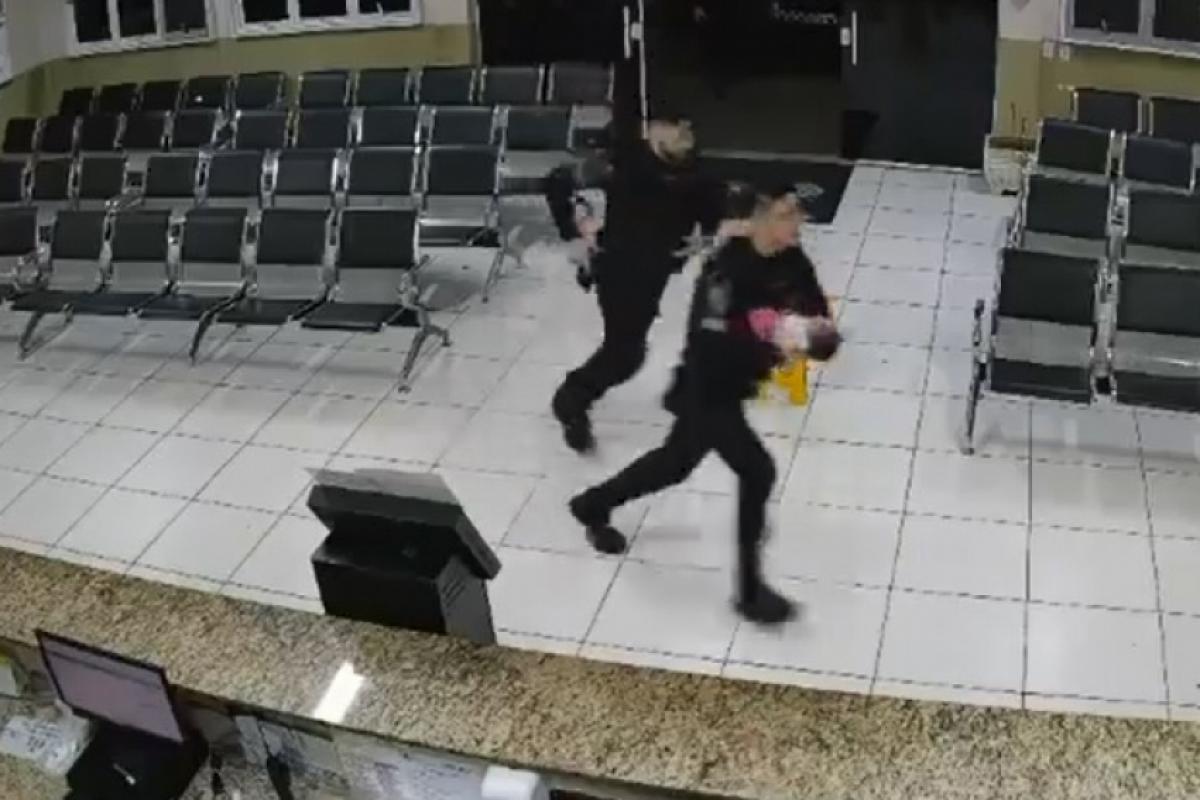 Câmera de segurança da UPA do Campo dos Alemães, na região sul de São José dos Campos, mostra dois guardas civis municipais entrando na unidade com a bebê de 14 dias que havia engasgado. Ela foi salva por um dos guardas que aplicou na criança a manobra de desengasgo (Heimlich), revertendo a situação.
