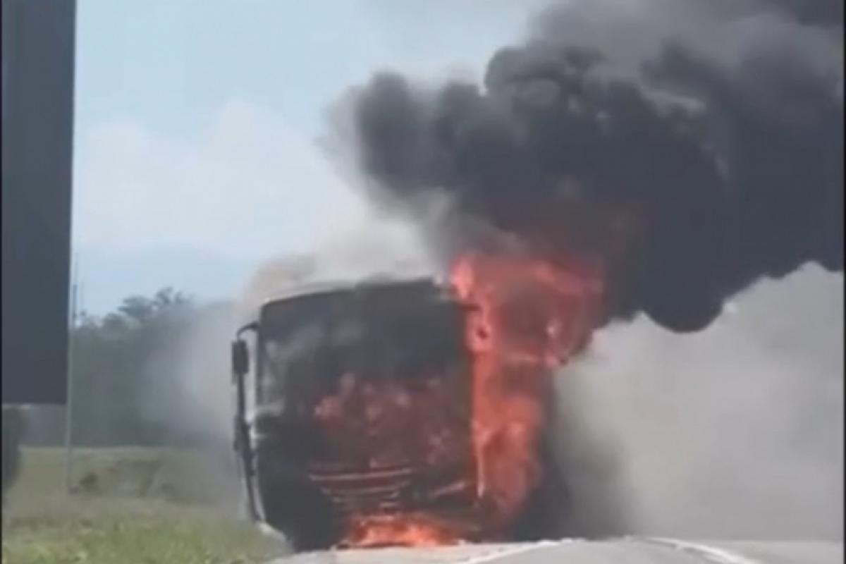 Um ônibus com 25 ocupantes pegou fogo no km 40 da Via Dutra, em Cachoeira Paulista, no sentido sul, na tarde deste sábado (25).