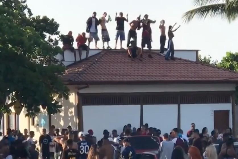 Um grupo de pessoas subiu no telhado da Escola Municipal de Surfe durante um fluxo, na manhã desta terça-feira (1º), em Ubatuba. O vídeo foi gravado por um morador durante a festa de rua, que ocorria na Praia Grande.