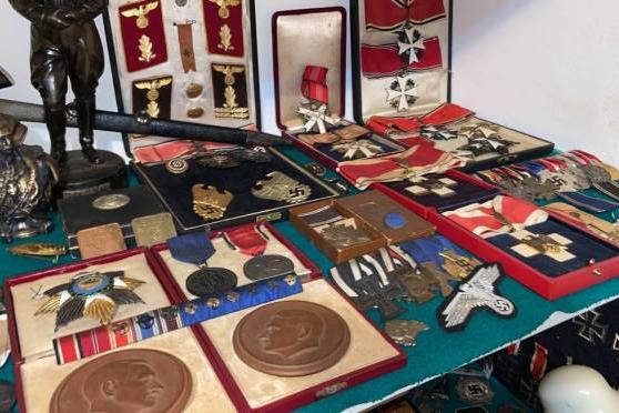 Foram achados também recortes de jornal dos anos 1950 sobre nazismo e fascismo, medalhas do Terceiro Reich, miniaturas de estátuas, veículos e submarinos e um capacete militar, entre dezenas de outros itens.