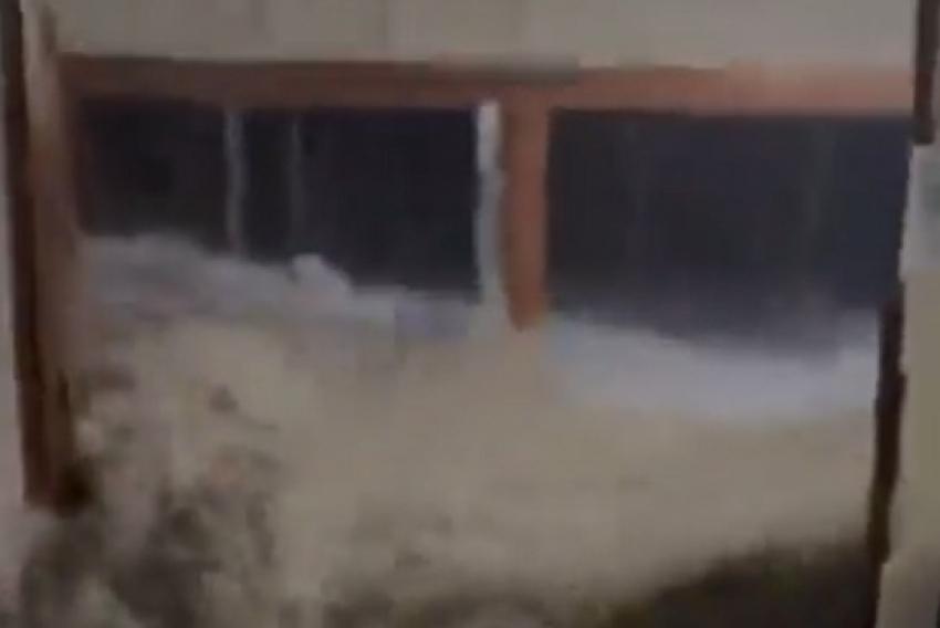 A cena gravada e divulgada nas redes sociais mostra o momento em que uma onda atinge o refeitório, arrombando portas e derrubando pessoas.