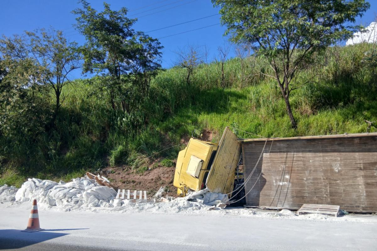 Um caminhão que transportava fertilizantes tombou na manhã desta quinta-feira (8) no km 143 da Rodovia Luiz de Queiroz (SP-304), no sentido Piracicaba. O acidente aconteceu por volta do meio-dia, após o desprendimento do pneu dianteiro, o que fez o veículo perder o controle e tombar no acostamento.