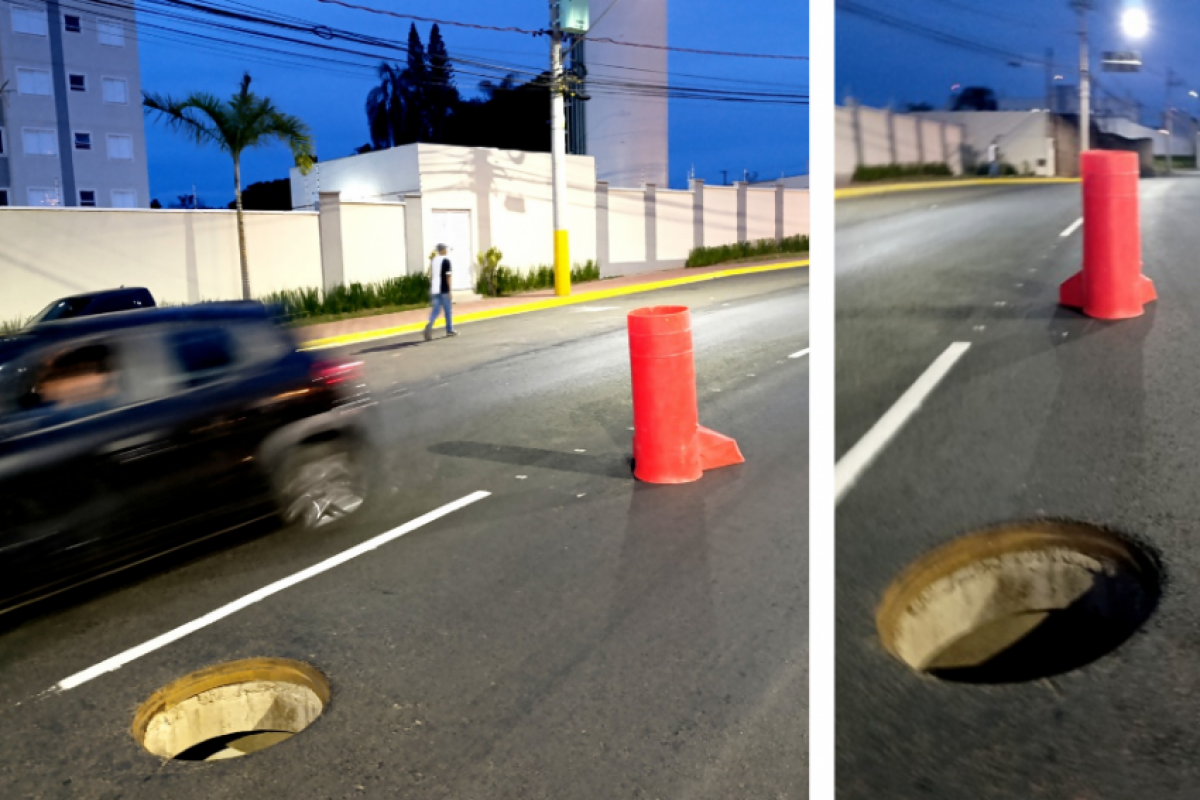 Motociclistas e motoristas estão correndo perigo diário na avenida Rio das Pedras, entre o Jardim Ipanema e o bairro Pompéia, em Piracicaba. Para sinalizar um bueiro no meio da via, foi improvisado um dispositivo de sinalização considerado insuficiente e perigoso por quem passa pelo local.