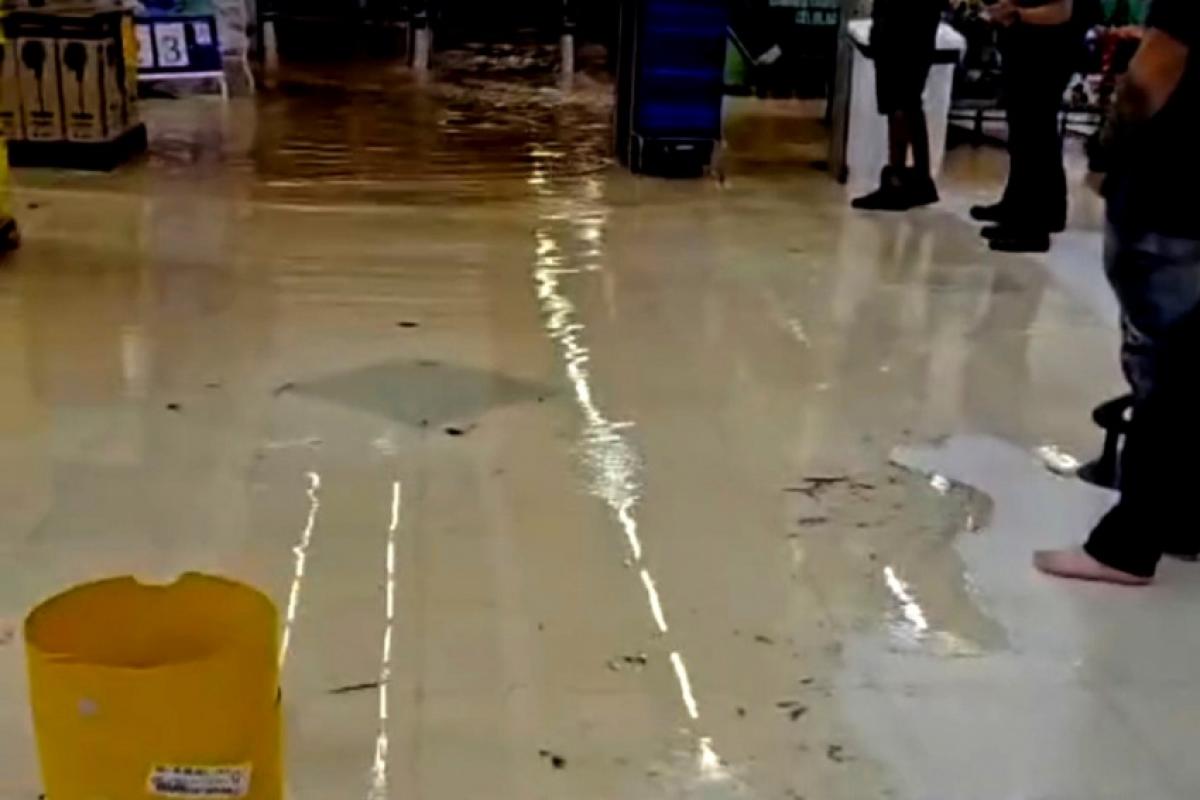 Em questão de minutos, a água avançou com força para dentro do estabelecimento, surpreendendo clientes e funcionários, que correram para se proteger enquanto o nível subia rapidamente.