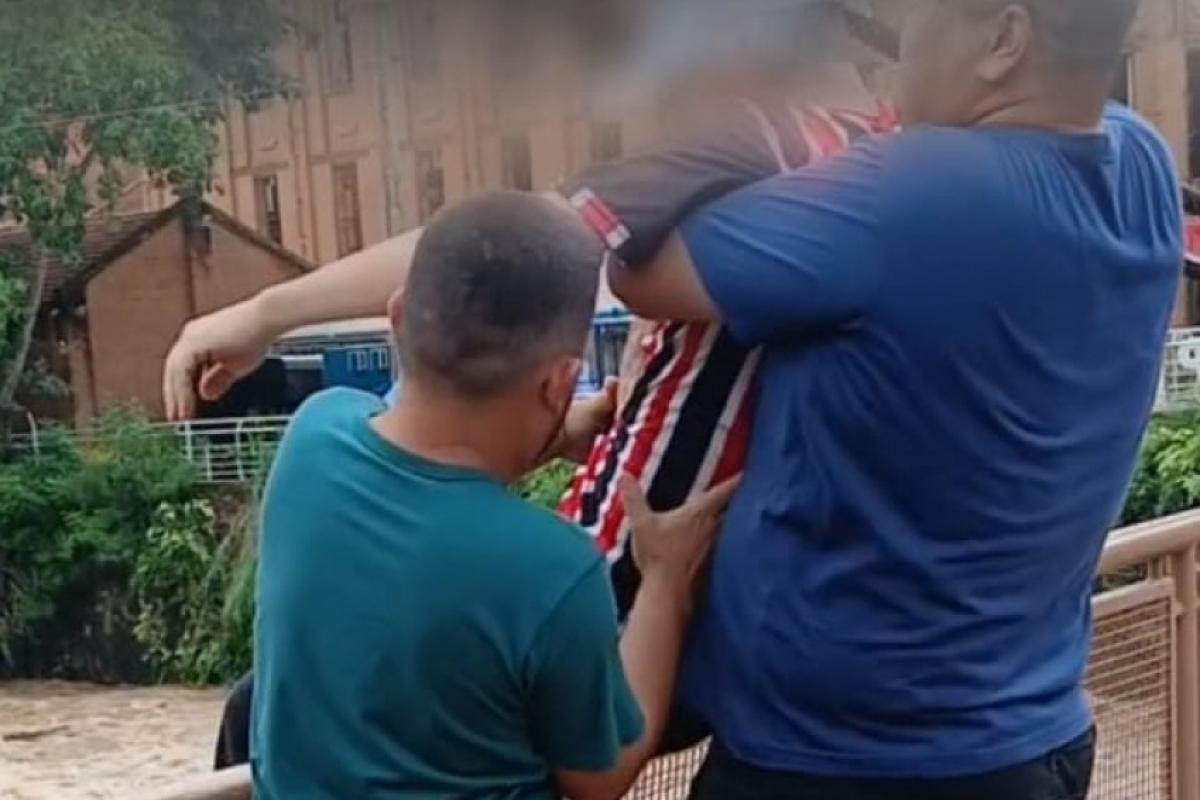 A tentativa de impedir o salto foi física. Os influenciadores Eduardo Severino e Danilo Favarim se aproximaram e retiraram o jovem da beira da ponte, chegando a pegá-lo no colo para afastá-lo do ponto de risco.