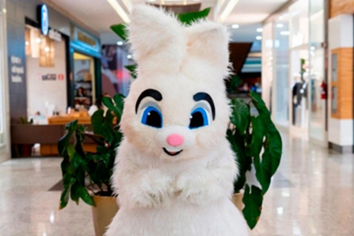Além das atividades, o espaço conta com ambientação temática e a presença do personagem do coelhinho da Páscoa, que interage com o público e reforça o clima festivo no local.