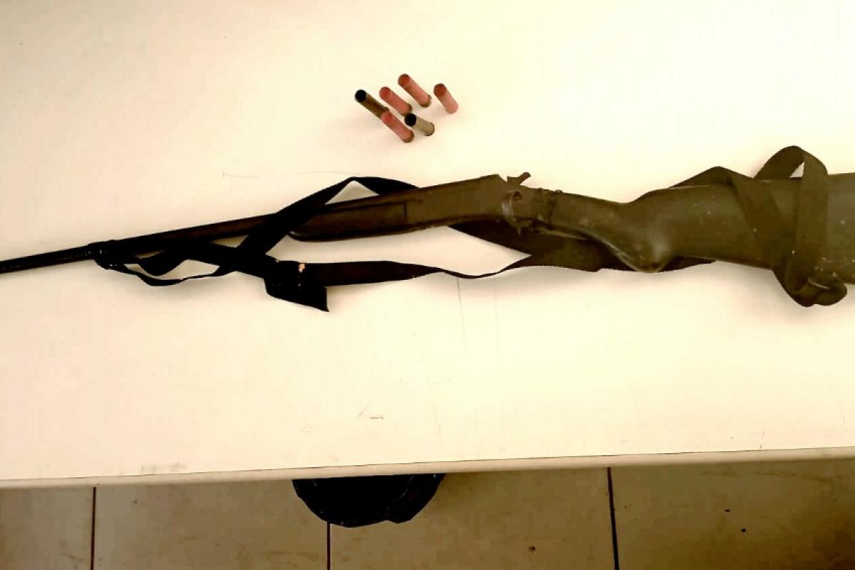 Os policiais conversaram com o suspeito, que acabou confirmando a história e mostrando onde havia escondido a arma, atrás da porta da casa. Durante a vistoria, a equipe encontrou a espingarda e seis cápsulas já usadas.