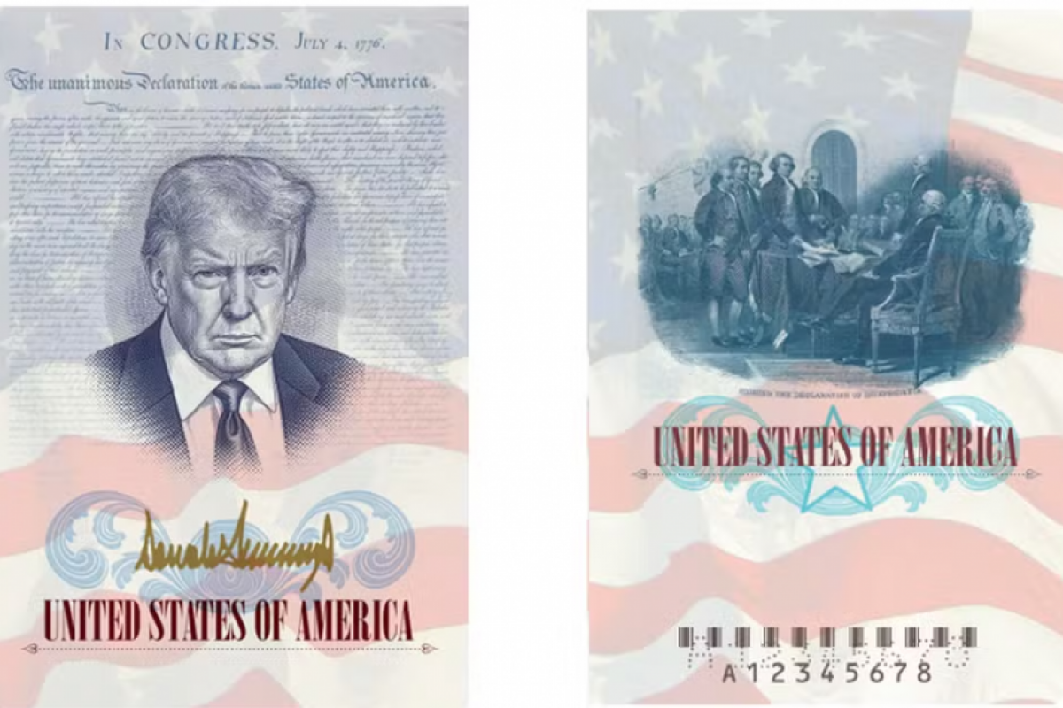 No caso dos passaportes, o projeto gráfico inclui uma ilustração inspirada no retrato oficial de Trump na parte interna da capa, acompanhada de sua assinatura em dourado. O fundo traz elementos simbólicos como a bandeira dos Estados Unidos e a Declaração de Independência.